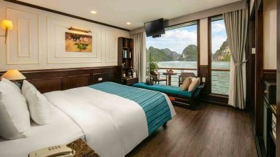 Magnifique jonque d'une cabine suite, idéale pour partir en croisière de plusieurs jours en couple, pour une découverte de la baie et de ses alentours en toute intimité. La qualité du bateau, du personnel naviguant et du service en font un des "must" des croisières privatives sur Ha Long : notre coup de cœur. Depuis 2012, la compagnie offre également des jonques exactement sur le même modèle et avec toujours la plus grande exigence de qualité en 2 et 3 cabines pour partir en famille ou entre amis.